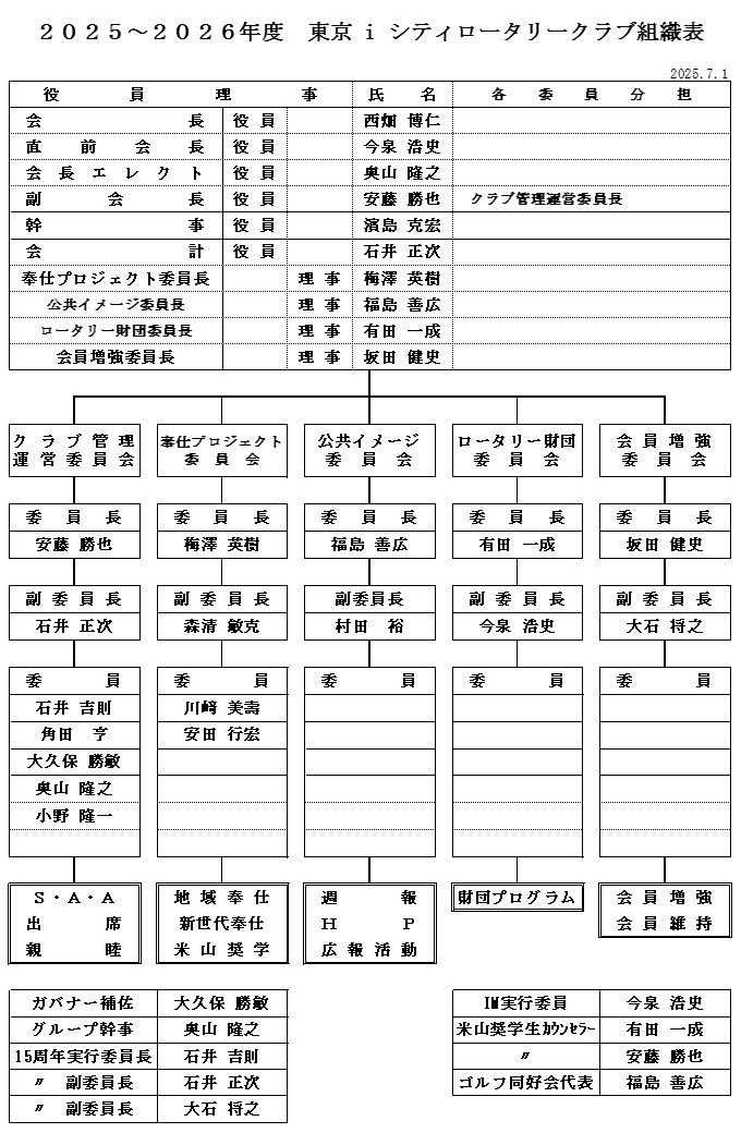東京 i シティロータリークラブ組織表 (2025~2026年度)